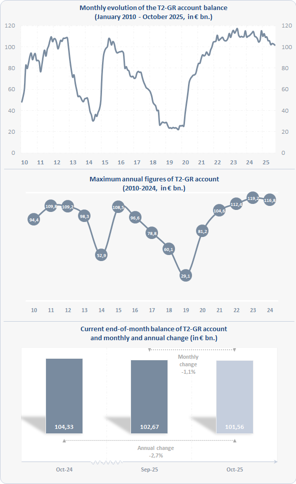 The following charts show the evolution over time of the balance (in € billions) of the BoG ECB account in TARGET, its maximum annual values, as well as its recent change both on an annual and a monthly basis.