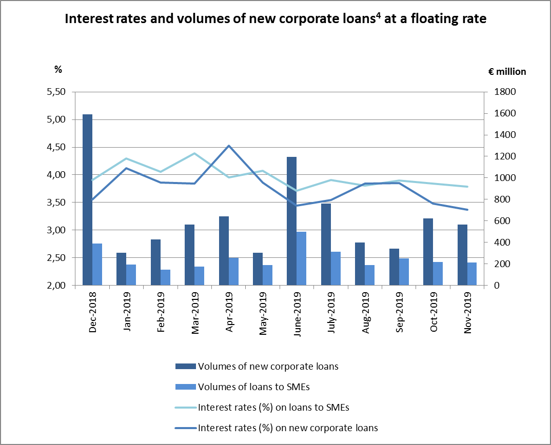 The average interest rate on corporate loans with a defined maturity at a floating rate[3] remained almost unchanged at 3.46%, in November 2019, whereas the volume of new business[4] decreased to €564 million from €625 million in the previous month. More specifically, the rate on loans with a defined maturity at a floating rate to small and medium-sized enterprises (SMEs) decreased by 6 basis points to 3.78%, whereas the corresponding volume of new business was €210 million in November 2019 compared with €214 million in the previous month (see Chart and Table 1).