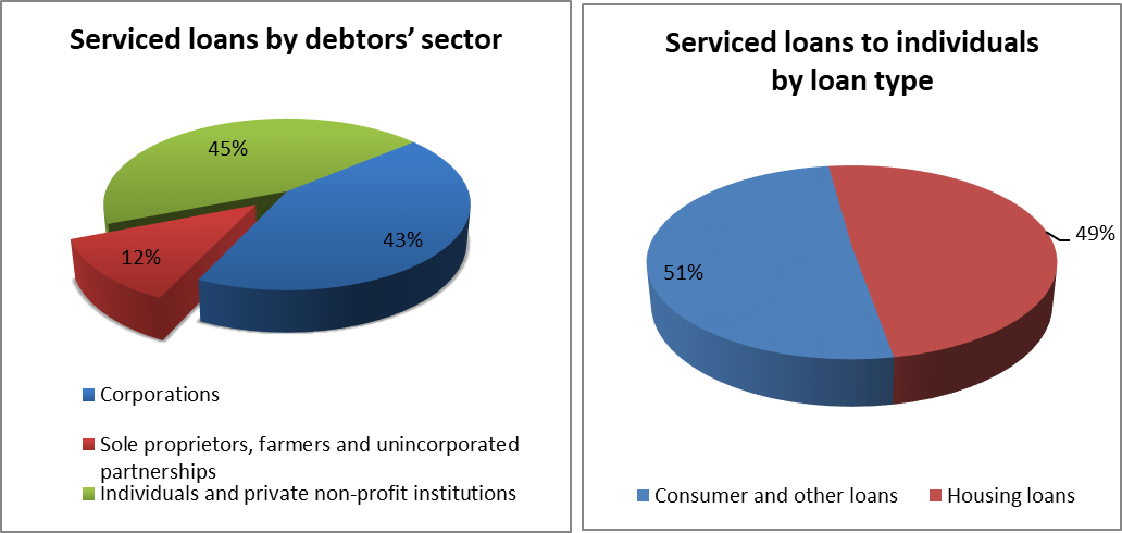 The nominal value of serviced corporate loans increased to €26,572 million in the second quarter of 2021, from €16,782 million in the previous quarter. In further detail, the nominal value of loans to non-financial corporations (NFCs) increased by €9,791 million to €26,493 million at the end of the second quarter of 2021. Out of the total of these loans to NFCs, an amount of €14,220 million corresponds to loans to small and medium-sized enterprises (SMEs).