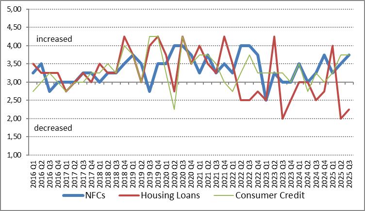 - The credit standards for household loans remained unchanged regarding housing loans and consumer credit loans for the third quarter of 2025. The terms and conditions tightened somewhat for housing loans, while for consumer loans they remained unchanged in the third quarter of 2025. The demand for housing loans decreased, while the demand for consumer credit increased.