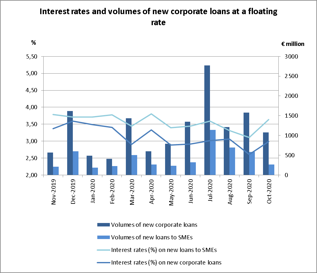 In October 2020 the average interest rate on corporate loans with a defined maturity at a floating rate increased by 33 basis points to 2.92%, whereas the volume of new business decreased to €1,080 million from €1,580 million in the previous month. More specifically, the interest rate on loans with a defined maturity at a floating rate to small and medium-sized enterprises (SMEs) increased to 3.63% from 3.11% in the previous month, whereas the corresponding volume of new business decreased to €265 million from €583 million in the previous month (see Chart and Table 1).