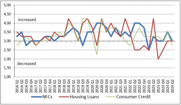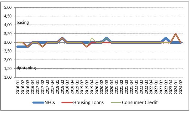 In the second quarter of 2024, the credit standards for loans to non-financial corporations (NFCs) remained unchanged compared with the first quarter of 2024 (see Chart 1), in line with the expectations expressed in the previous quarterly survey round. Moreover, banks expect credit standards to remain unchanged during also the third quarter of 2024.