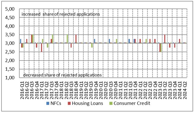 During the second quarter of 2024, the ratio of rejected applications for housing loans and consumer credit remained unchanged (see Chart 3).