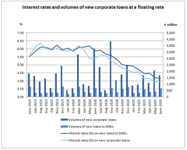The average interest rate on new corporate loans with a defined maturity at a floating rate remained unchanged at 3.95%. The average interest rate on loans with a defined maturity at a floating rate to small and medium-sized enterprises (SMEs) decreased by 5 basis points to 4.15%.