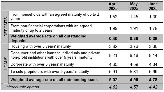 - In June 2025, the weighted average interest rate on outstanding amounts of deposits remained almost unchanged at 0.36%, while the corresponding rate on loans decreased to 4.78%.