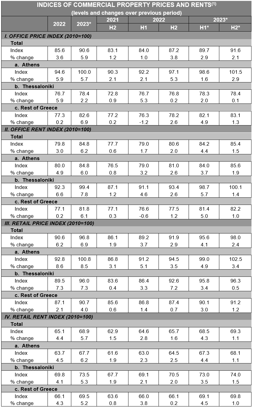 In 2023, retail rents of all classes for the entire country increased on average by 5.7% in nominal terms (provisional data). Broken down by region, the corresponding average annual rates of increase were 6.2% in Athens, 5.3% in Thessaloniki and 5.2% in the rest of Greece.
