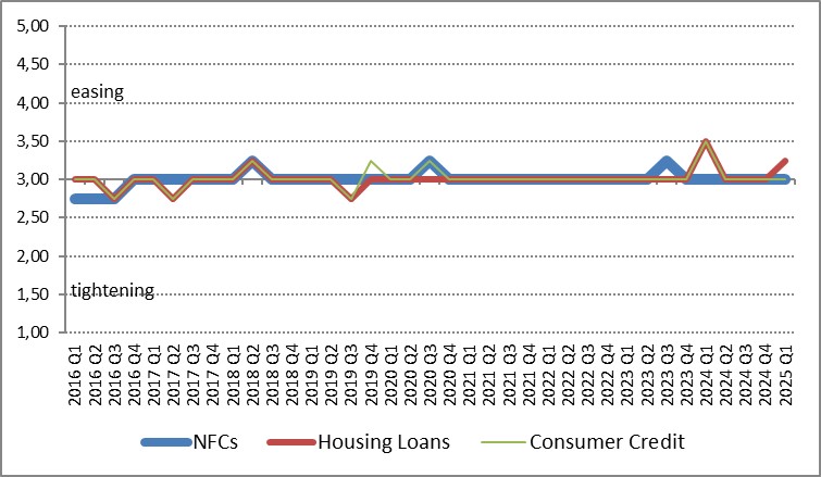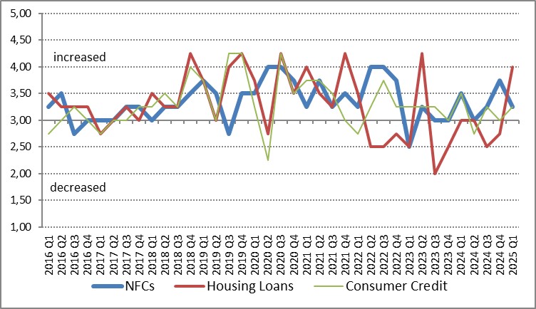 In the first quarter of 2025, the credit standards for loans to households remained almost unchanged regarding housing loans and unchanged regarding consumer credit loans (see Chart 1). The terms and conditions for housing tightened due to charge increases besides the interest rate, while for consumer and other credit loans it remained unchanged, during the first quarter of 2025. During the second quarter of 2025, banks expect that credit standards for housing and consumer credit loans will remain unchanged.