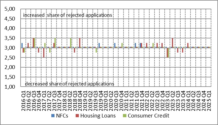 During the first quarter of 2025, the ratio of rejected applications for housing loans and consumer credit remained unchanged (see Chart 3).