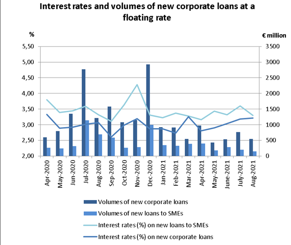 In August 2021, the average interest rate on corporate loans with a defined maturity at a floating rate increased to 3.22% compared to 3.18% in the previous month. More specifically, the interest rate on loans with a defined maturity at a floating rate to small and medium-sized enterprises (SMEs) decreased to 3.30% from 3.60% in the previous month.