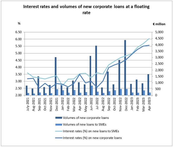 In April 2023, the average interest rate on new corporate loans with a defined maturity at a floating rate increased by 5 basis points to 5.56%. The average interest rate on loans with a defined maturity at a floating rate to small and medium-sized enterprises (SMEs) increased by 37 basis points to 6.05%.