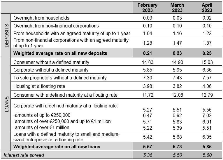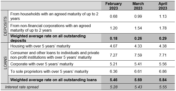 - In April 2023, the weighted average interest rate on new deposits remained almost unchanged at 0.25%, while the corresponding rate on new loans increased to 5.85%.