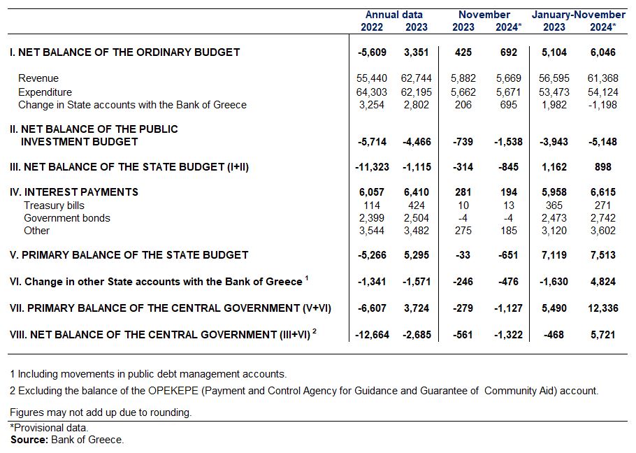 In January-November 2024, the central government cash balance recorded a surplus of €5,721 million, compared to a deficit of €468 million in the same period of 2023. During this period, ordinary budget revenue amounted to €61,368 million, compared to €56,595 million in the corresponding period of last year. Ordinary budget expenditure amounted to €54,124 million, from €53,473 million in January-November 2023.