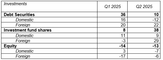 Total holdings of investment fund shares increased to €902 million at the end of the second quarter of 2025, from €843 million in the previous quarter. The increase in these holdings is mainly due to net purchases of foreign shares and an increase in domestic and foreign shares’ prices. Investment fund holdings’ share in total assets increased to 34.2%, compared with 33.2% in the previous quarter.