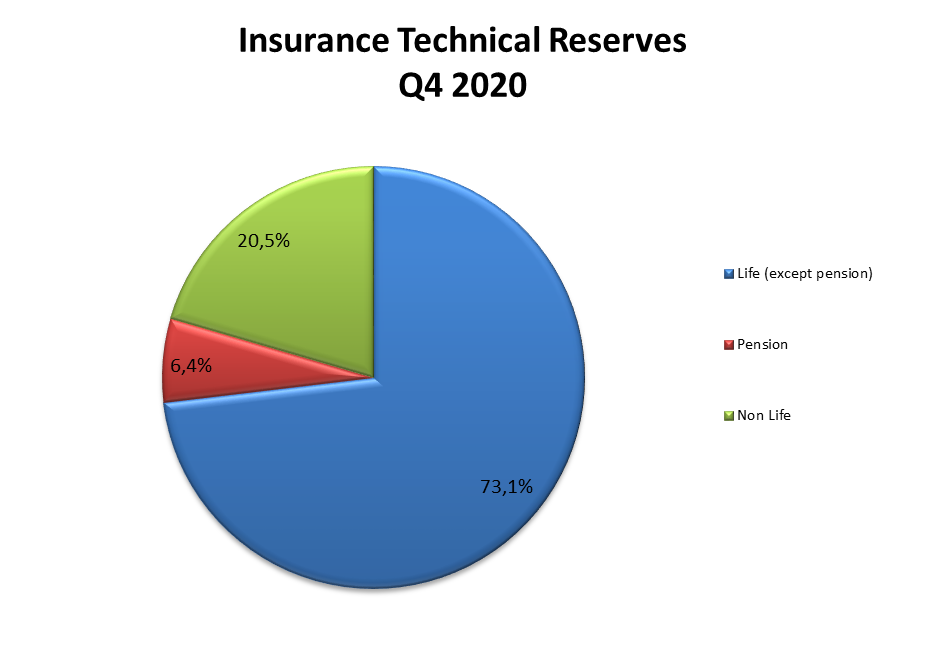 On the liabilities side, own funds increased by €180 million to €3,381 million at the end of the fourth quarter of 2020. Total insurance technical reserves increased by €280 million to €14,887 million, mainly due to the increase in life technical reserves by €332 million. Νon-life insurance technical reserves decreased by €52 million to €3,050 million. Life technical reserves (other than pension entitlements) accounted for 73.1% of total technical reserves.