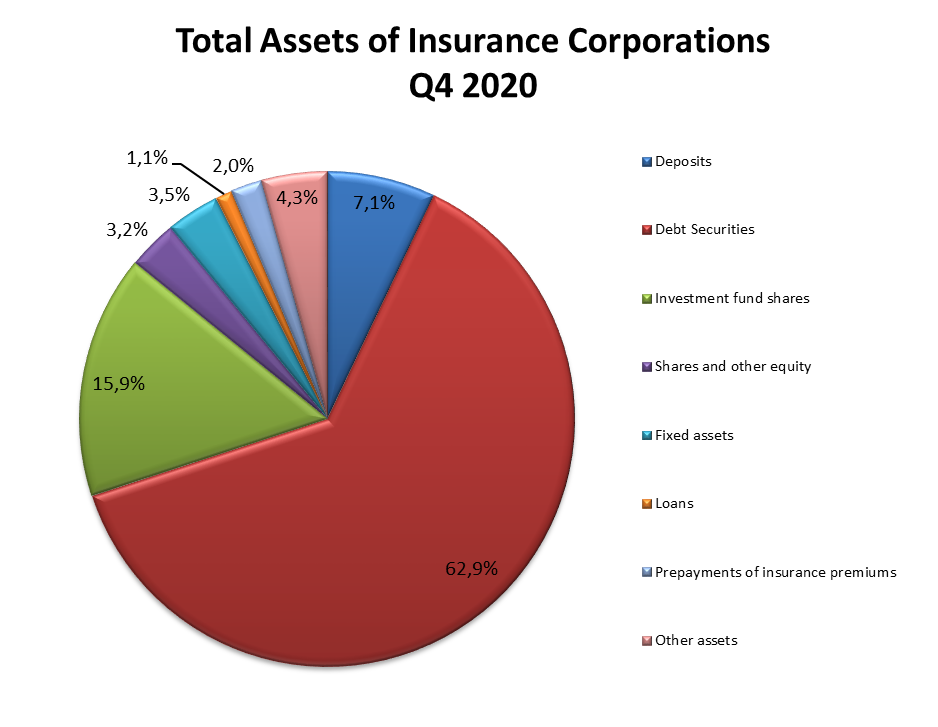 In further detail, the overall deposits of insurance corporations increased by €15 million to €1,414 million at the end of the fourth quarter of 2020. Deposits with domestic credit institutions increased by €56 million, while deposits with foreign credit institutions decreased by €41 million. Deposits accounted for 7.1% of total assets in the fourth quarter of 2020 compared with 7.2% in the previous quarter.