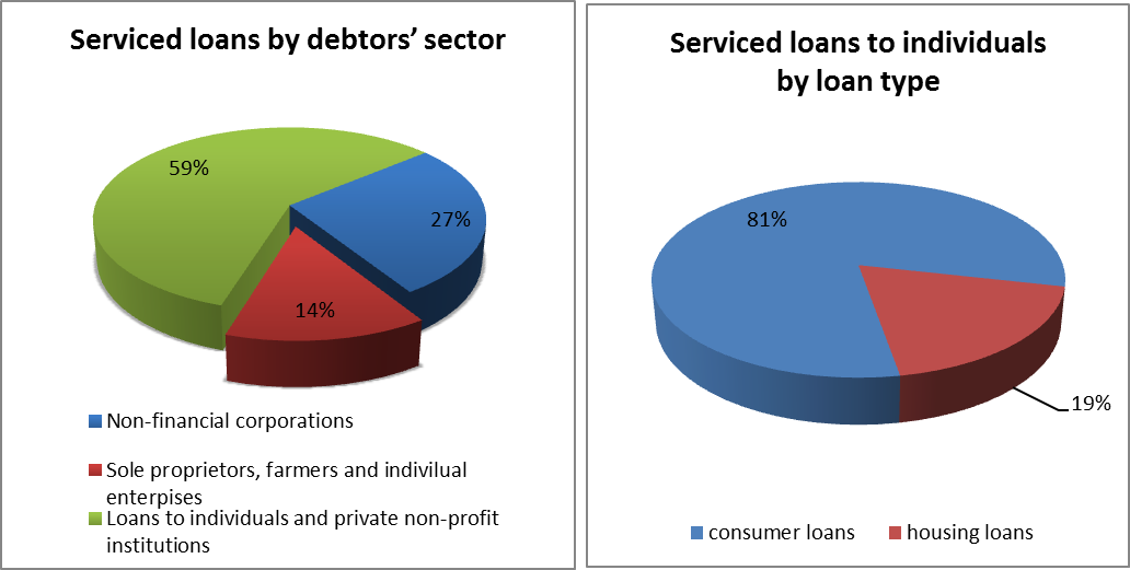 The nominal value of loans to individuals and private non-profit institutions, serviced by the CSFs, increased by €1,422 million to €13,863 million at the end of the fourth quarter of 2019. In further detail, the serviced consumer loans increased by €1,434 million to €11,539 million, while the corresponding housing loans decreased by €12 million to €2,317 million.