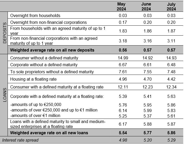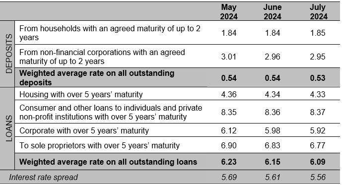 - In July 2024, the weighted average interest rate on outstanding amounts of deposits remained almost unchanged at 0.53%, while the corresponding rate on loans decreased to 6.09%.