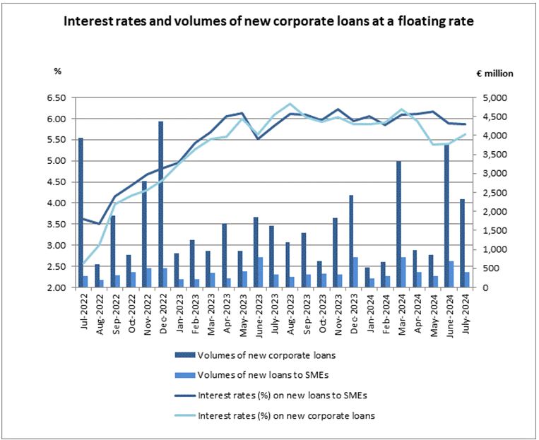The average interest rate on new corporate loans with a defined maturity at a floating rate increased by 22 basis points to 5.63%. The average interest rate on loans with a defined maturity at a floating rate to small and medium-sized enterprises (SMEs) remained almost unchanged at 5.87%.