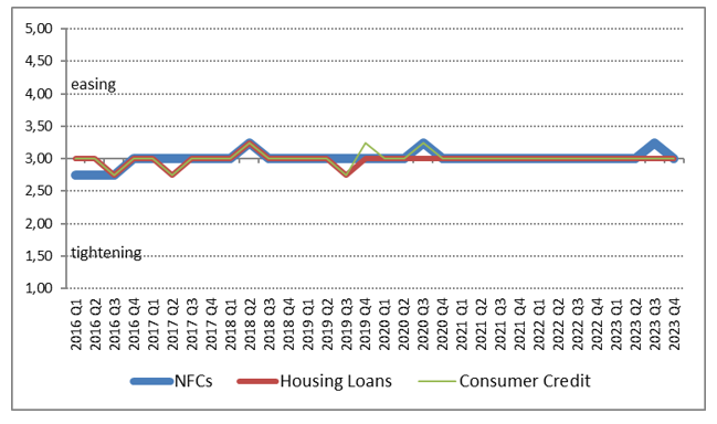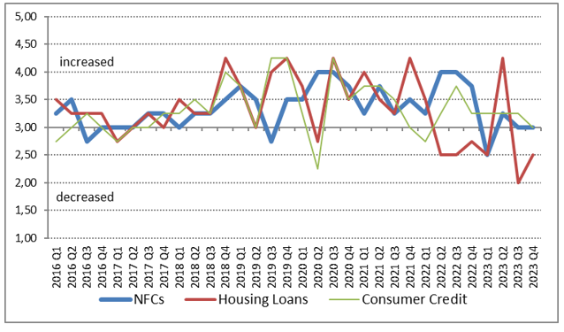 The overall terms and conditions for loans to NFCs remained unchanged compared with the third quarter of 2023, although there was some pressure from the competition to ease terms on average loans.