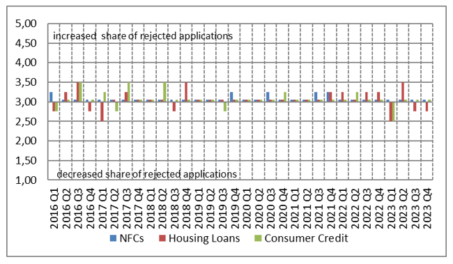 In the fourth quarter of 2023, the ratio of rejected applications for loans to NFCs remained unchanged compared with the previous quarter (see Chart 3).