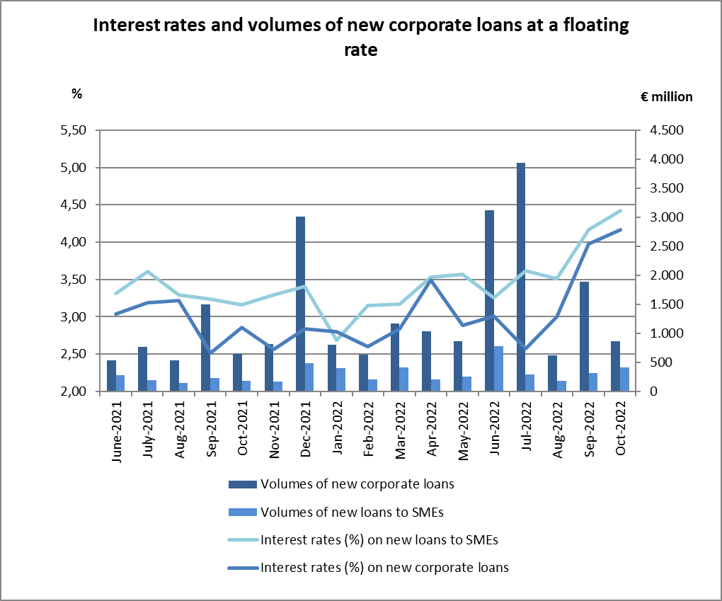 In October 2022, the average interest rate on corporate loans with a defined maturity at a floating rate increased by 20 basis points to 4.17%. The average interest rate on loans with a defined maturity at a floating rate to small and medium-sized enterprises (SMEs) increased by 25 basis points to 4.42%.