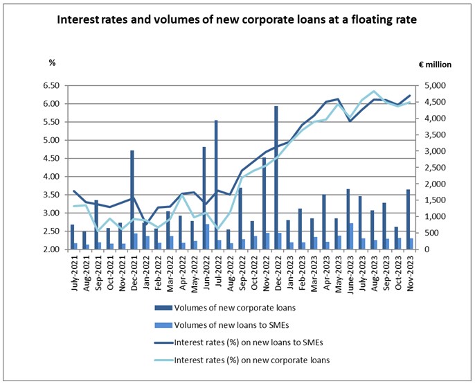 In November 2023, the average interest rate on new corporate loans with a defined maturity at a floating rate increased by 11 basis points to 6.04%. The average interest rate on loans with a defined maturity at a floating rate to small and medium-sized enterprises (SMEs) increased by 26 basis points to 6.23%.