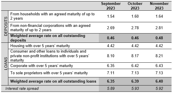 - In November 2023, the weighted average interest rates on outstanding amounts of deposits and loans remained almost unchanged at 0.48% and at 6.40% respectively.