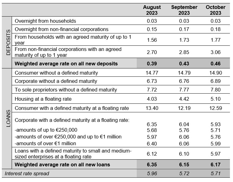 - In October 2023, the weighted average interest rate on new deposits increased to 0.46%, while the corresponding rate on new loans remained almost unchanged at 6.17%.