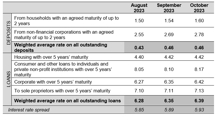 - In October 2023, the weighted average interest rate on outstanding amounts of deposits remained unchanged at 0.46%, while the corresponding rate on loans increased to 6.39%.