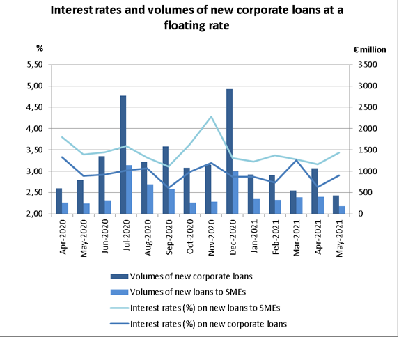 In May 2021, the average interest rate on corporate loans with a defined maturity at a floating rate increased by 28 basis points to 2.90%. More specifically, the interest rate on loans with a defined maturity at a floating rate to small and medium-sized enterprises (SMEs) increased to 3.44% from 3.16% in the previous month.