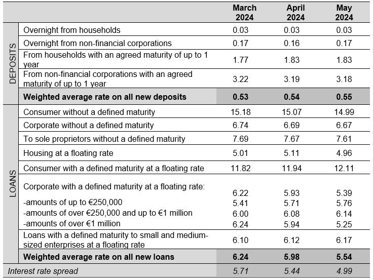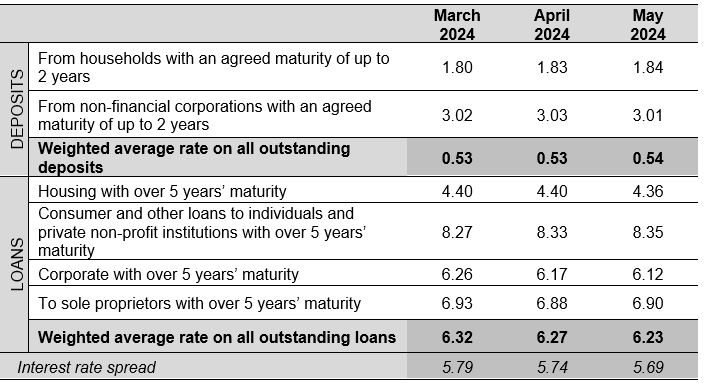 - In May 2024, the weighted average interest rate on outstanding amounts of deposits remained almost unchanged at 0.54%, while the corresponding rate on loans decreased to 6.23%.