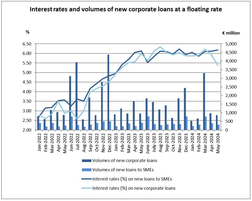 The average interest rate on new corporate loans with a defined maturity at a floating rate decreased by 54 basis points to 5.39%. The average interest rate on loans with a defined maturity at a floating rate to small and medium-sized enterprises (SMEs) increased by 5 basis points to 6.17%.