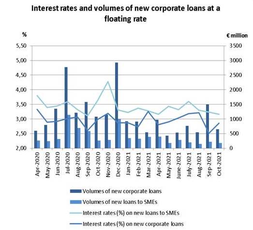 In October 2021, the average interest rate on corporate loans with a defined maturity at a floating rate increased by 34 basis points to 2.85% compared to 2.51% in the previous month. The interest rate on loans with a defined maturity at a floating rate to small and medium-sized enterprises (SMEs) decreased to 3.16% from 3.24% in the previous month.