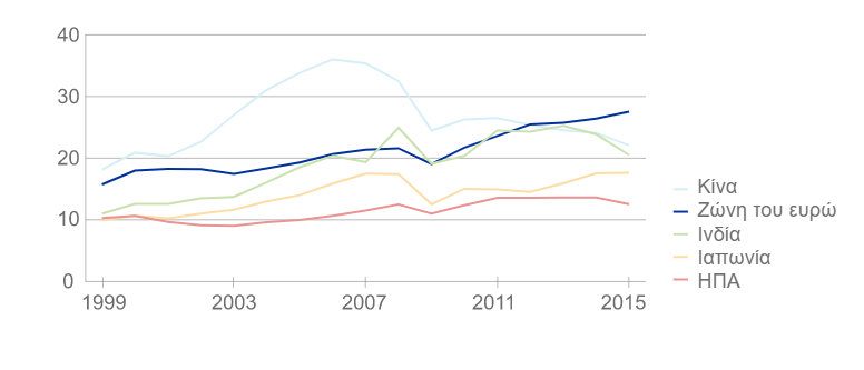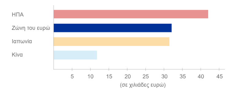 Πηγές: Eurostat, Παγκόσμια Τράπεζα και υπολογισμοί της ΕΚΤ. Σημείωση: 2016. Τα στοιχεία που αφορούν τις ΗΠΑ, την Ιαπωνία και την Κίνα παρέχονται βάσει ισοδυναμίας αγοραστικής δύναμης του ΟΟΣΑ.