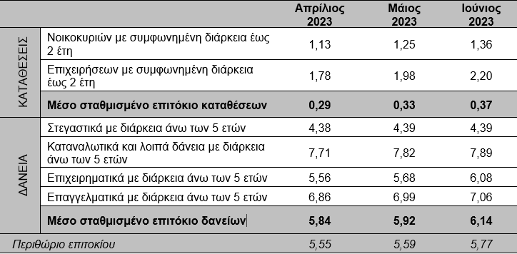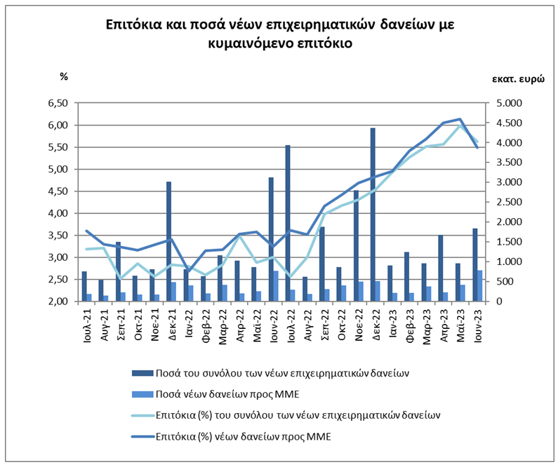 Το μέσο επιτόκιο των νέων επιχειρηματικών δανείων με συγκεκριμένη διάρκεια και κυμαινόμενο επιτόκιο μειώθηκε κατά 36 μονάδες βάσης, τον Ιούνιο του 2023, και διαμορφώθηκε στο 5,63%. Το μέσο επιτόκιο των δανείων τακτής λήξης με κυμαινόμενο επιτόκιο προς μικρομεσαίες επιχειρήσεις (ΜΜΕ) μειώθηκε κατά 64 μονάδες βάσης και διαμορφώθηκε στο 5,49%.