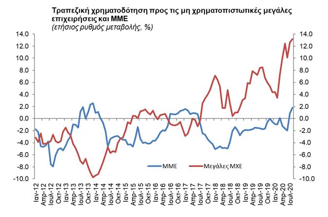 Κατά συνέπεια, η ανάλυση των ροών χρηματοδότησης προς τις επιχειρήσεις επιβεβαιώνει την αύξηση χρηματοδότησης στις ΜΧΕ μεγάλου μεγέθους. Αξίζει μάλιστα να σημειωθεί ότι στην αύξηση της χρηματοδότησης των ΜΧΕ μεγάλου μεγέθους για την περίοδο Μαρτίου-Ιουλίου 2020 συνέβαλαν πιστοδοτήσεις συγκεκριμένων πολύ μεγάλων επιχειρήσεων της βιομηχανίας (ΕΛΠΕ, Motor Oil, ΤΙΤΑΝ και ΜΥΤΙΛΗΝΑΙΟΣ, Lamda Olympia Village AE) και άλλων κλάδων (ΟΠΑΠ), που απορρόφησαν περίπου τη μισή χρηματοδότηση. Εν ολίγοις, οι πολύ μεγάλες επιχειρήσεις έσπευσαν να επωφεληθούν από τη ρευστότητα και τους ευνοϊκούς όρους του τραπεζικού τομέα.