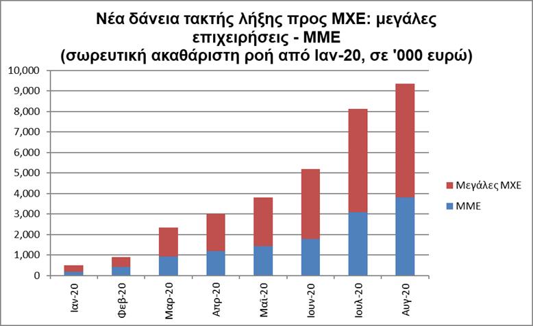Όσον αφορά τα ποσά της τραπεζικής πίστης, η μέση μηνιαία ακαθάριστη ροή των τραπεζικών δανείων τακτής λήξης προς ΜΧΕ (όπως προκύπτει από τα στοιχεία συμβάσεων για νέα δάνεια) ανήλθε σε 1,2 δισεκ. ευρώ (δηλαδή σε διπλάσιο ύψος σε σύγκριση με την αντίστοιχη περίοδο του 2019), ενώ για το οκτάμηνο η σωρευτική ακαθάριστη ροή τραπεζικών δανείων τακτής λήξης (δηλαδή το ύψος των νέων δανείων τακτής λήξης) ανήλθε σε 9,35 δισεκ. ευρώ, εκ των οποίων 3,8 δισεκ. ευρώ αφορούν τις μικρομεσαίες και 5,5 δισεκ. ευρώ τις μεγάλες ΜΧΕ (βλ. Γράφημα 2). Αξίζει να σημειωθεί ότι σχεδόν το 1/3 της χρηματοδότησης αυτής ή 3,3 δισεκ. ευρώ πραγματοποιήθηκε στο πλαίσιο των προγραμμάτων για την αντιμετώπιση της πανδημικής κρίσης.