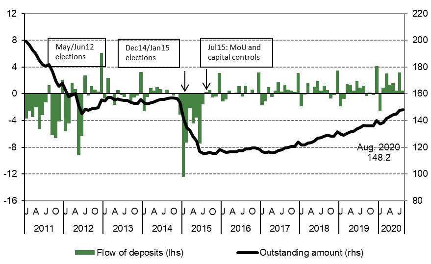 Το υπόλοιπο των καταθέσεων του ιδιωτικού τομέα συνέχισε να αυξάνεται κατά το 2020, με επιταχυνόμενο μάλιστα ρυθμό, πιθανόν αντανακλώντας τη συγκέντρωση διαθεσίμων από τις επιχειρήσεις κατά την περίοδο της πανδημίας είτε για λόγους πρόνοιας έναντι μελλοντικών αναγκών είτε λόγω αναβολής πραγματοποίησης δαπανών ή και την πίστωση προϊόντος δανείου. Ενδεικτικά, στο τέλος Αυγούστου του 2020, το υπόλοιπο καταθέσεων ΜΧΕ και νοικοκυριών ανήλθε σε περίπου 148 δισεκ. ευρώ (καταθέσεις και ρέπος 151,9 δισεκ., εκ των οποίων 32,0 δισεκ. των ΜΧΕ και 119,9 δισεκ. των νοικοκυριών), έναντι 140 δισεκ. ευρώ στο τέλος του 2019 και 138,5 στο τέλος Φεβρουαρίου του 2020 (βλ. Γράφημα 3). Στη διάρκεια της πανδημίας οι καταθέσεις αυξήθηκαν κατά 10,2 δισεκ. ευρώ, ήτοι κατά 6,2 δισεκ. για τις ΜΧΕ και κατά 4 δισεκ. για τα νοικοκυριά.
