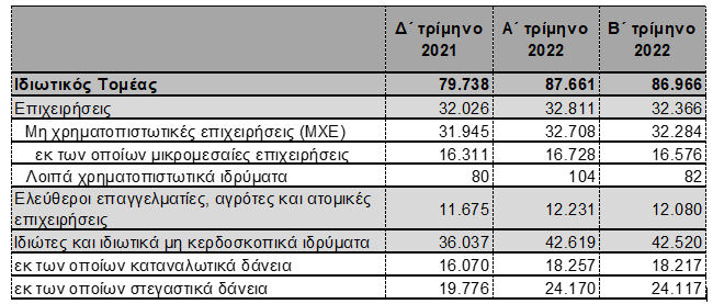 Η ονομαστική αξία των υπό διαχείριση δανείων προς ελεύθερους επαγγελματίες, αγρότες και ατομικές επιχειρήσεις μειώθηκε κατά 151 εκατ. ευρώ έναντι του προηγούμενου τριμήνου και διαμορφώθηκε σε 12.080 εκατ. ευρώ στο τέλος του β΄ τριμήνου του 2022.