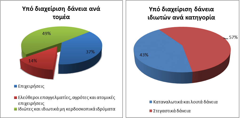 Η ονομαστική αξία των υπό διαχείριση δανείων προς ιδιώτες και ιδιωτικά μη κερδοσκοπικά ιδρύματα μειώθηκε κατά 99 εκατ. ευρώ έναντι του προηγούμενου τριμήνου και διαμορφώθηκε σε 42.520 εκατ. ευρώ στο τέλος του β΄ τριμήνου του 2022. Αναλυτικότερα, τα υπό διαχείριση καταναλωτικά δάνεια παρουσίασαν μείωση κατά 40 εκατ. ευρώ και διαμορφώθηκαν σε 18.217 εκατ. ευρώ. Τα υπό διαχείριση στεγαστικά δάνεια παρουσίασαν μείωση κατά 53 εκατ. ευρώ και διαμορφώθηκαν σε 24.117 εκατ. ευρώ.