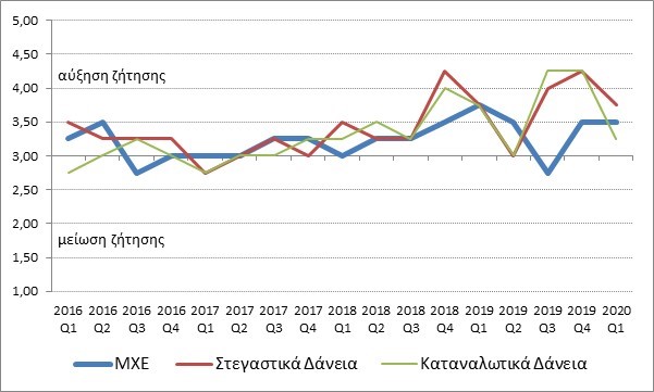 Η ζήτηση για στεγαστικά δάνεια παρουσίασε αύξηση ως έναν βαθμό σε σχέση με το δ΄ τρίμηνο του 2019, ενώ η ζήτηση για καταναλωτικά δάνεια παρέμεινε αμετάβλητη (βλ. Διάγραμμα 2). Παράγοντες που επηρέασαν την αύξηση της ζήτησης κατά το α’ τρίμηνο του 2020 ήταν η βελτίωση των προοπτικών της αγοράς κατοικίας, συμπεριλαμβανομένων των αναμενόμενων εξελίξεων στις τιμές των οικιστικών ακινήτων, καθώς και η προ της εξάπλωσης της πανδημίας στην Ελλάδα αύξηση της εμπιστοσύνης των καταναλωτών.