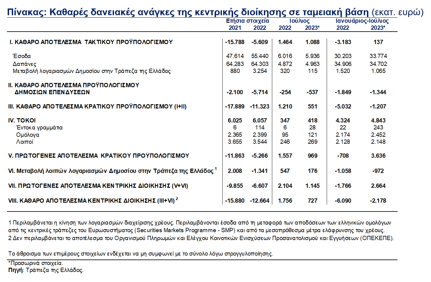 Την περίοδο Ιανουαρίου-Ιουλίου 2023, το ταμειακό αποτέλεσμα της κεντρικής διοίκησης παρουσίασε έλλειμμα 2.178 εκατ. ευρώ, έναντι ελλείμματος 6.090 εκατ. ευρώ την αντίστοιχη περίοδο του 2022. Κατά την περίοδο αυτή, τα έσοδα του τακτικού προϋπολογισμού διαμορφώθηκαν σε 33.774 εκατ. ευρώ, από 30.203 εκατ. ευρώ πέρυσι. Όσον αφορά τις δαπάνες του τακτικού προϋπολογισμού, αυτές διαμορφώθηκαν σε 34.702 εκατ. ευρώ, από 34.906 εκατ. ευρώ την περίοδο Ιανουαρίου-Ιουλίου 2022.