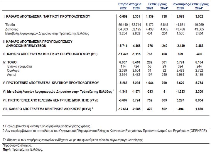 Την περίοδο Ιανουαρίου-Σεπτεμβρίου 2024, το ταμειακό αποτέλεσμα της κεντρικής διοίκησης παρουσίασε πλεόνασμα 1.870 εκατ. ευρώ, έναντι ελλείμματος 494 εκατ. ευρώ την αντίστοιχη περίοδο του 2023. Κατά την περίοδο αυτή, τα έσοδα του τακτικού προϋπολογισμού διαμορφώθηκαν σε 49.269 εκατ. ευρώ, από 44.851 εκατ. ευρώ πέρυσι. Όσον αφορά τις δαπάνες του τακτικού προϋπολογισμού, αυτές διαμορφώθηκαν σε 43.665 εκατ. ευρώ, από 43.438 εκατ. ευρώ την περίοδο Ιανουαρίου-Σεπτεμβρίου 2023.