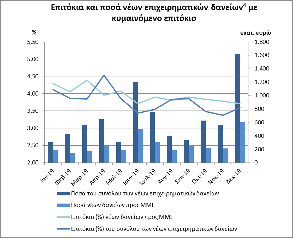 Το μέσο επιτόκιο των επιχειρηματικών δανείων με συγκεκριμένη διάρκεια και κυμαινόμενο επιτόκιο[3] αυξήθηκε κατά 12 μονάδες βάσης και ανήλθε στο 3,58%, το Δεκέμβριο του 2019, ενώ το ποσό των νέων δανείων[4] αυξήθηκε σε 1.621 εκατ. ευρώ έναντι 564 εκατ. ευρώ κατά τον προηγούμενο μήνα. Ειδικότερα, τo μέσο επιτόκιο των δανείων τακτής λήξης με κυμαινόμενο επιτόκιο προς μικρομεσαίες επιχειρήσεις (ΜΜΕ) μειώθηκε κατά 7 μονάδες βάσης και διαμορφώθηκε στο 3,71%, ενώ το αντίστοιχο ποσό των δανείων διαμορφώθηκε σε 602 εκατ. ευρώ, το Δεκέμβριο του 2019, έναντι 210 εκατ. ευρώ τον προηγούμενο μήνα (βλ. Διάγραμμα και Πίνακα 1).