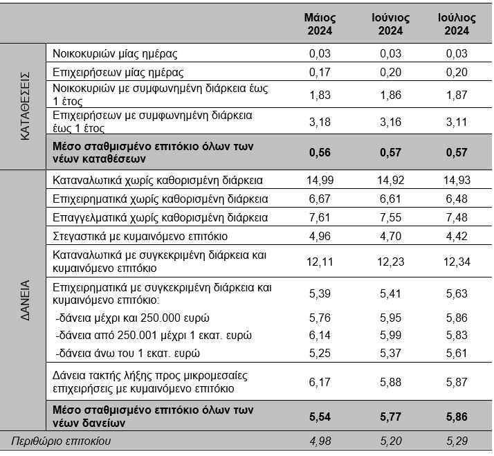 - Τον Ιούλιο του 2024, το μέσο σταθμισμένο επιτόκιο των νέων καταθέσεων παρέμεινε αμετάβλητο στο 0,57%, ενώ το αντίστοιχο επιτόκιο των νέων δανείων αυξήθηκε στο 5,86%.