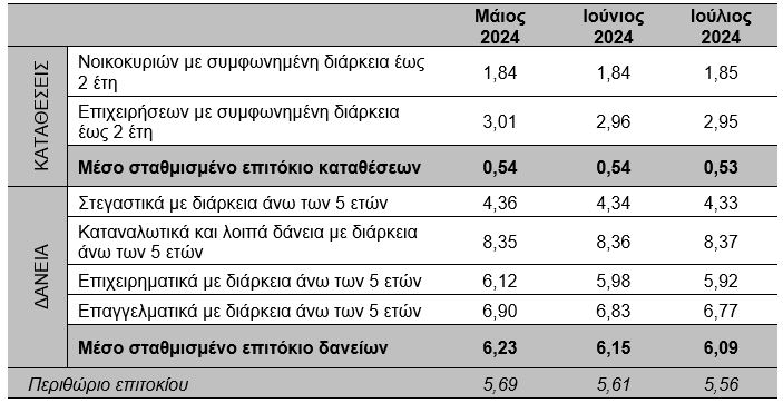 - Τον Ιούλιο του 2024, το μέσο σταθμισμένο επιτόκιο του συνόλου των υφιστάμενων καταθέσεων παρέμεινε σχεδόν αμετάβλητο στο 0,53%, ενώ το αντίστοιχο επιτόκιο των δανείων μειώθηκε στο 6,09%.