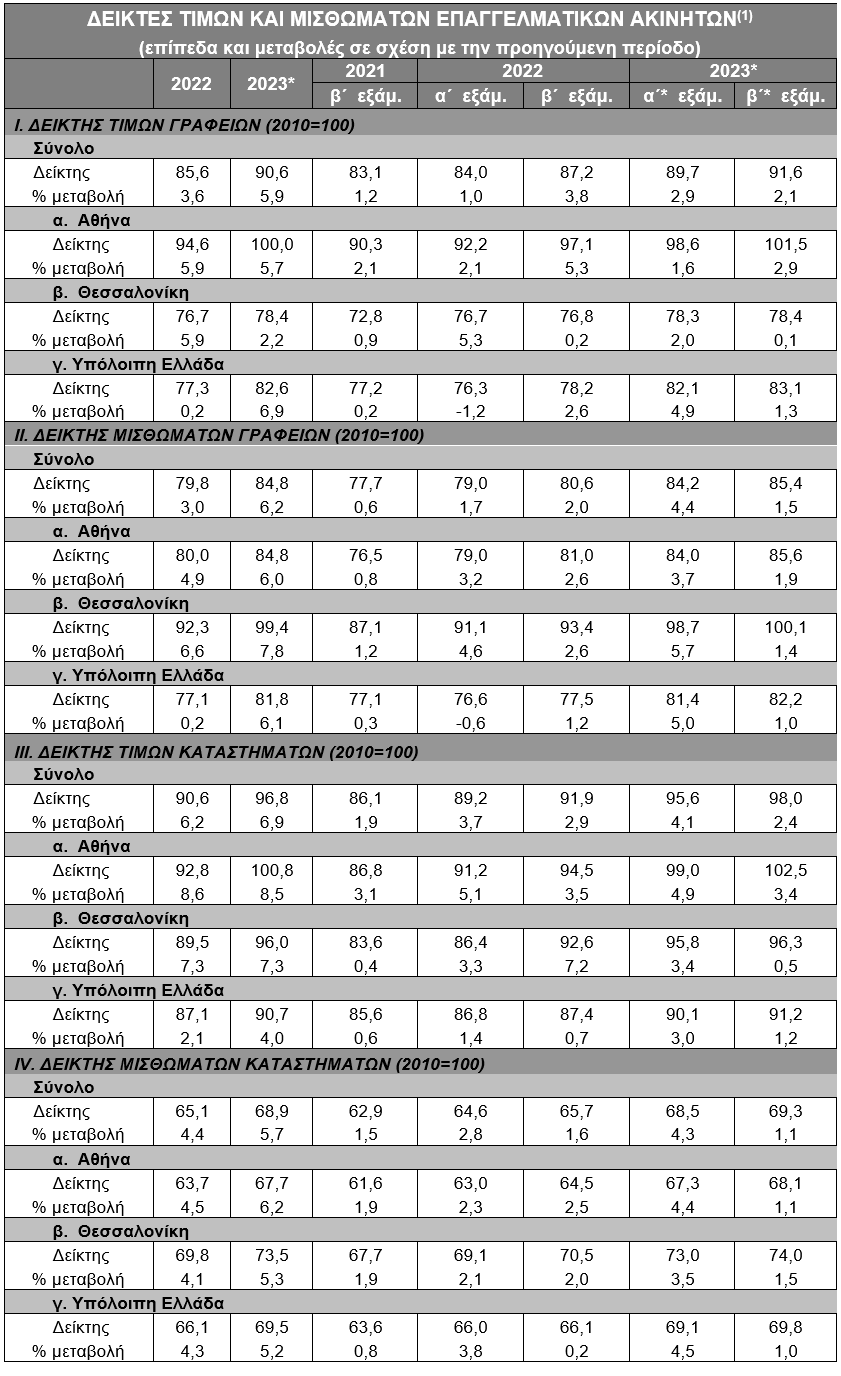 Δείκτες επαγγελματικών ακινήτων: β΄ εξάμηνο 2023