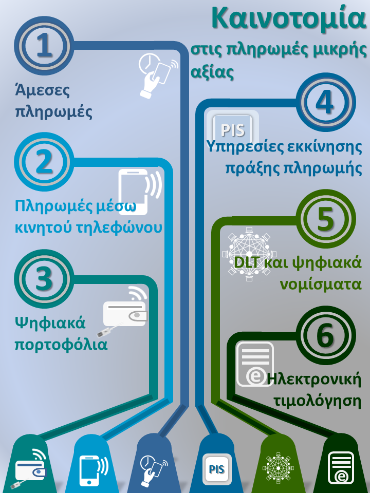 Συνεπώς, οι καινοτόμες λύσεις στις πληρωμές αποτελούν σημαντικό παράγοντα για την ανάπτυξη μιας ενιαίας και ανταγωνιστικής αγοράς πληρωμών μικρής αξίας σε ευρώ. Για να μη λειτουργούν οι καινοτόμες λύσεις ως φραγμός εισόδου ούτε να συμβάλλουν στον κατακερματισμό των υπηρεσιών πληρωμών που προσφέρονται στην Ευρώπη ή να απειλούν την ασφάλεια και την ακεραιότητα των συστημάτων πληρωμών, η μελέτη και ανάλυση από την Τράπεζα της Ελλάδος ως ΕθνΚΤ επικεντρώνεται συνοπτικά στα παρακάτω πεδία: